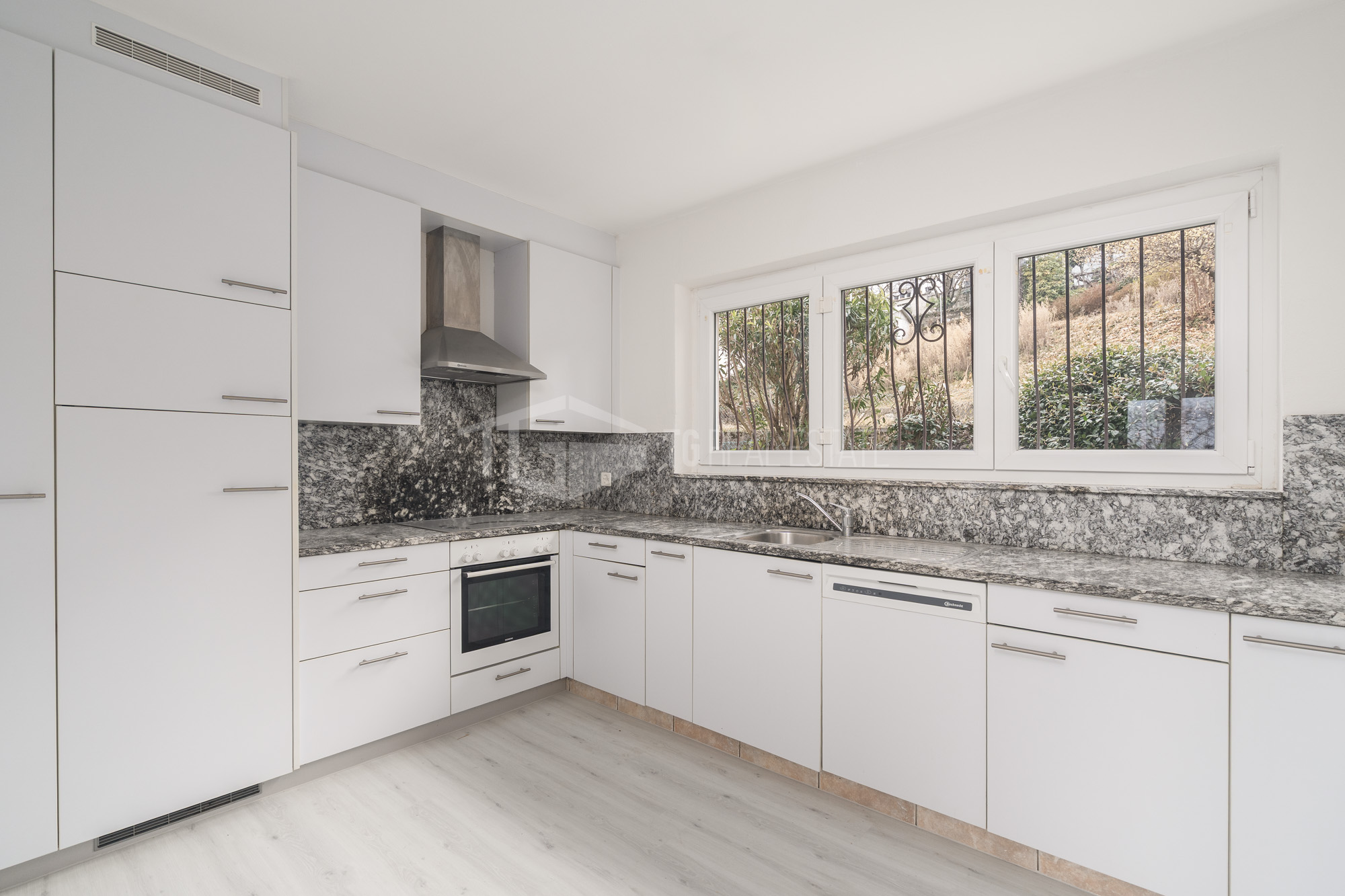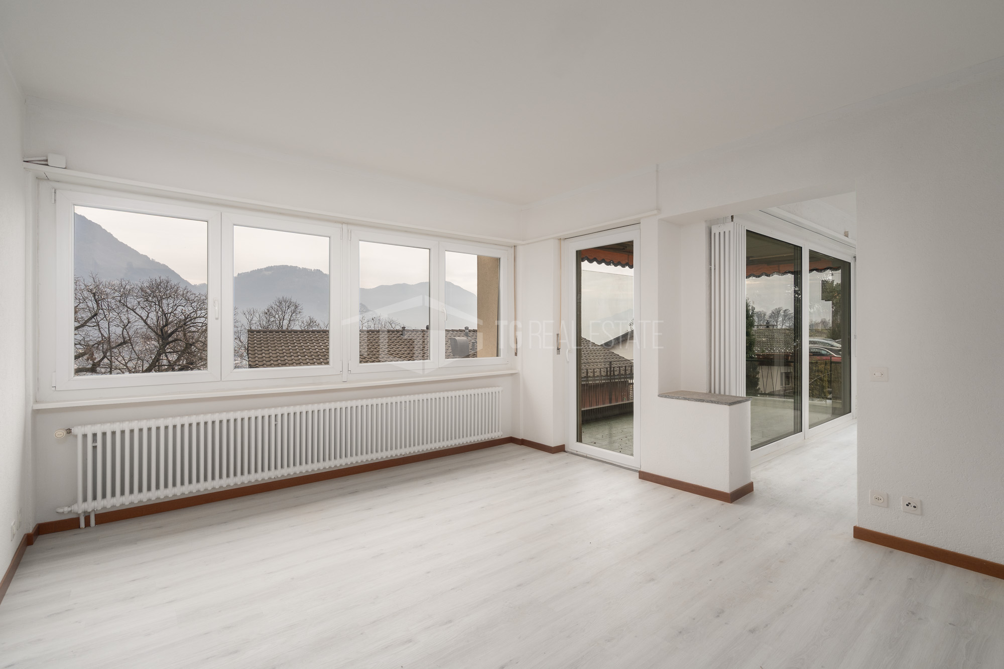La cucina abitabile è separata e guarda sulla sala da pranzo con una bella vista sulle montagne. Nella zona notte si trovano due camere, di cui una con armadi a muro, e un bagno finestrato con vasca.