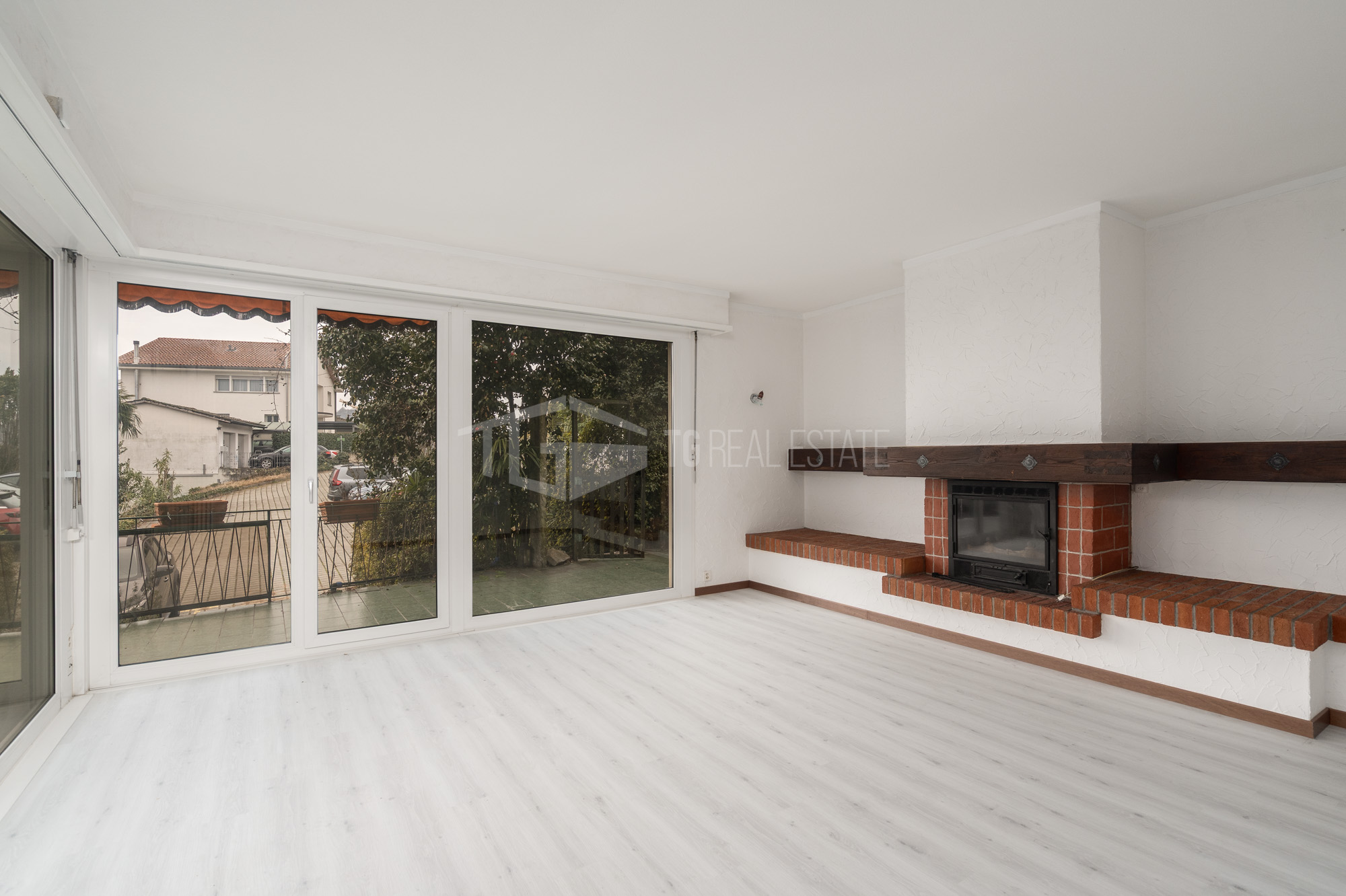 Dall'ampio ingresso si accede al soggiorno con camino, da qui si va verso il terrazzo coperto e al giardino.