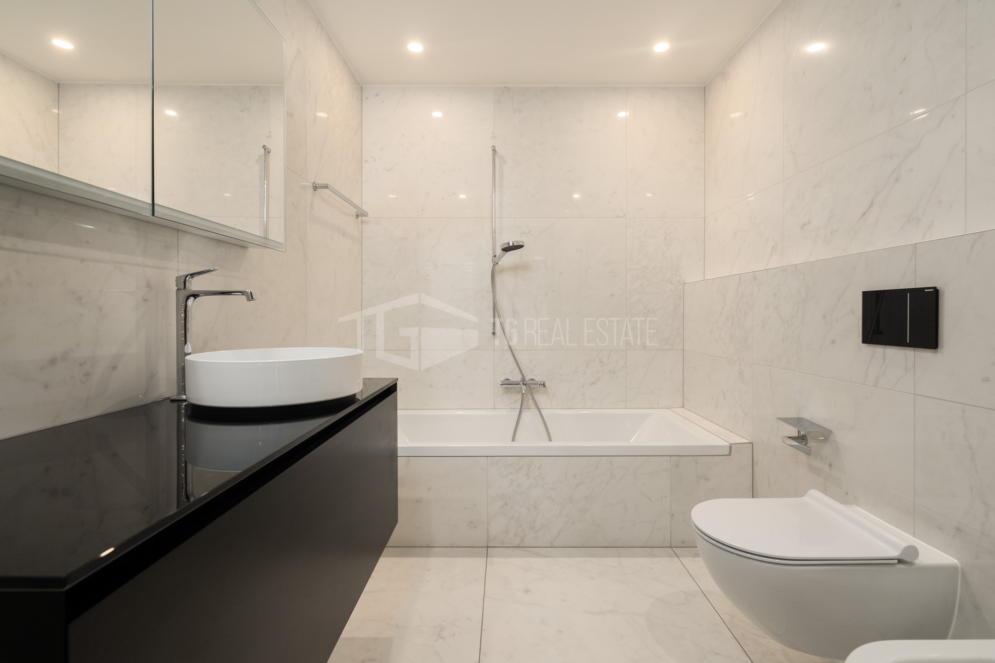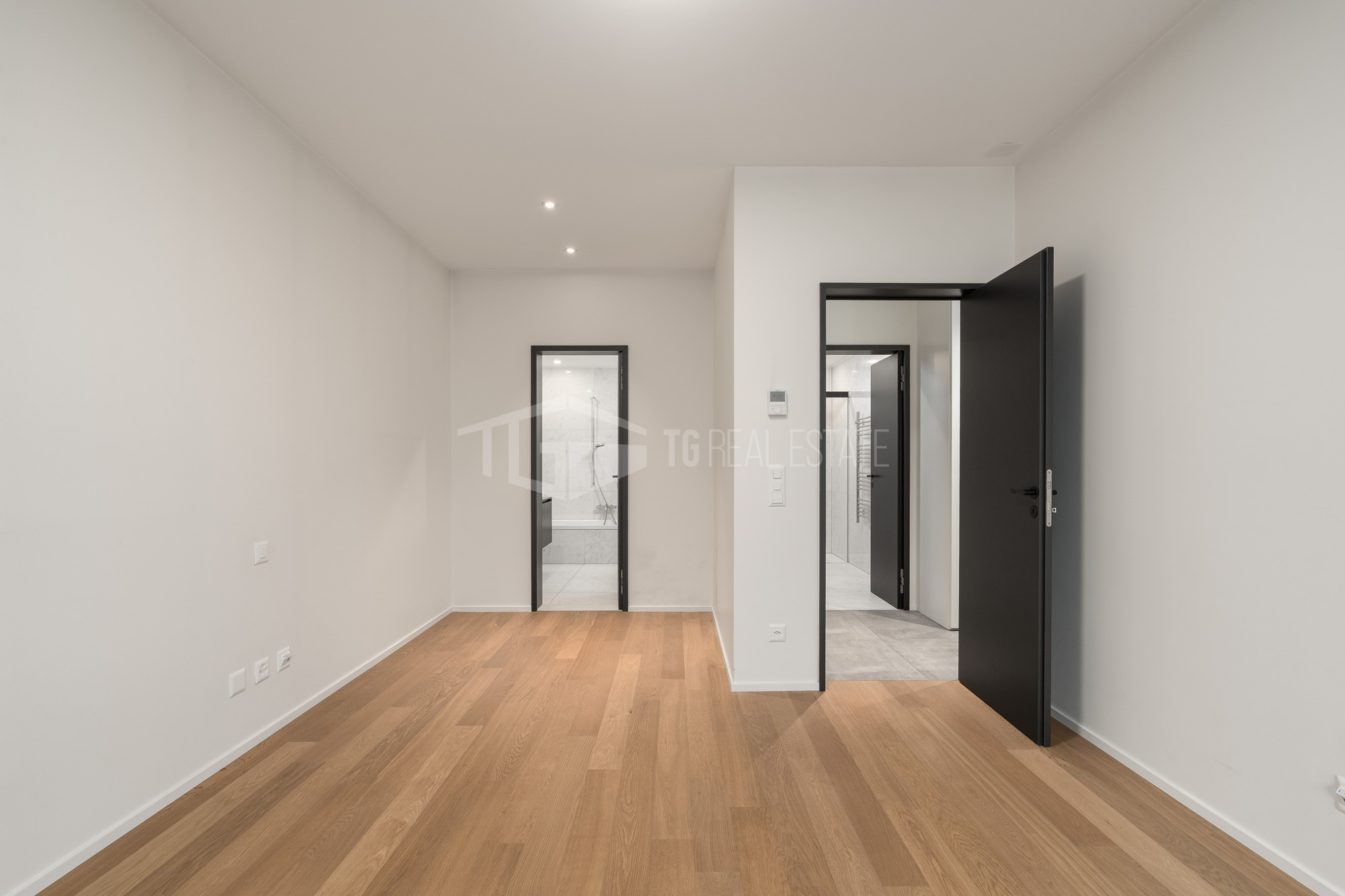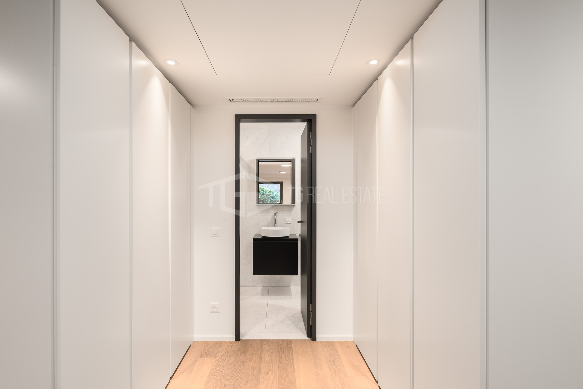 Zona Notte: Camera master con bagno en-suite e area guardaroba. Seconda camera e bagno esterno con doccia, corridoio con armadi a muro.