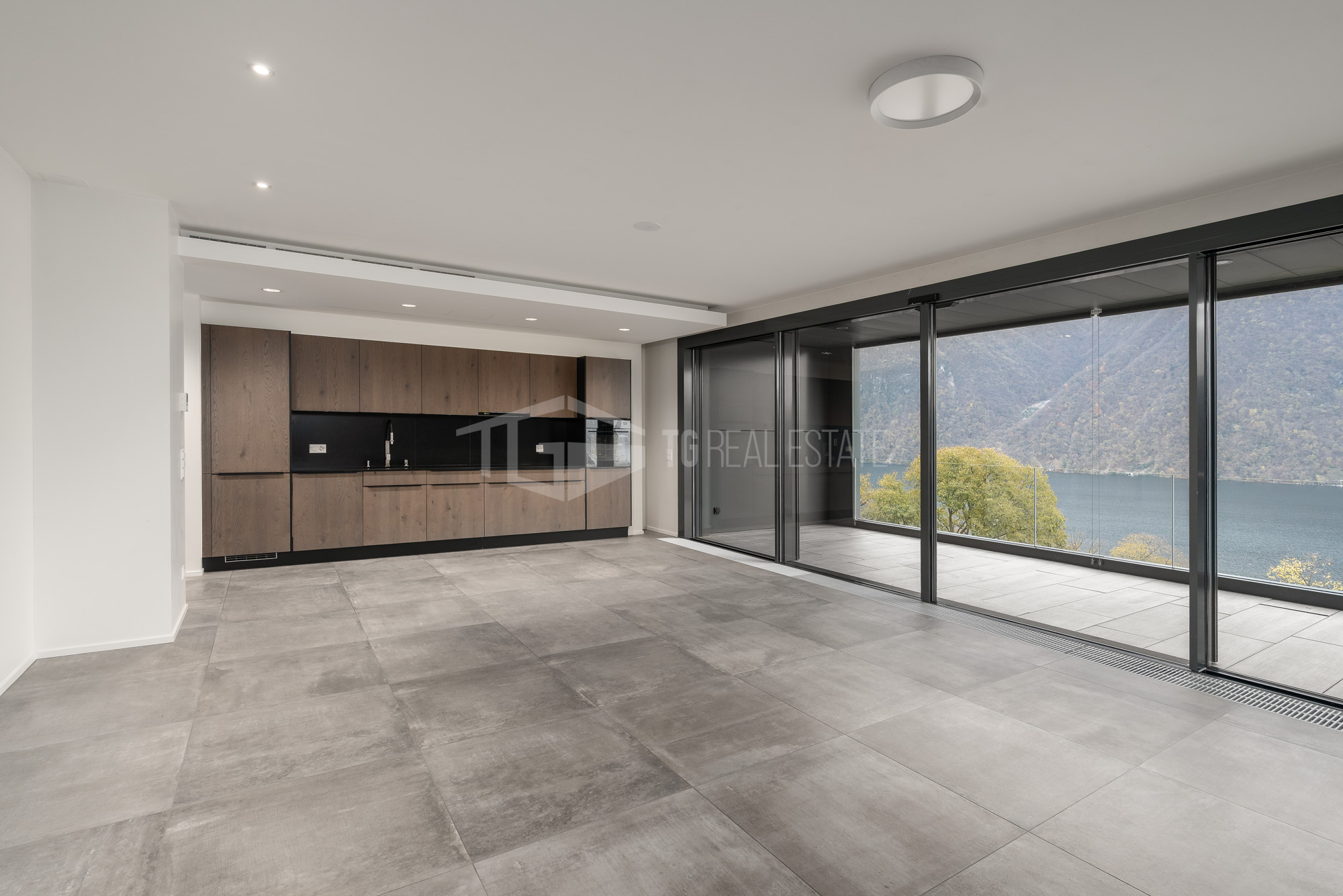 Zona Giorno: Open space con sala da pranzo, soggiorno e cucina moderna, accesso al grande terrazo affacciato sul lago.