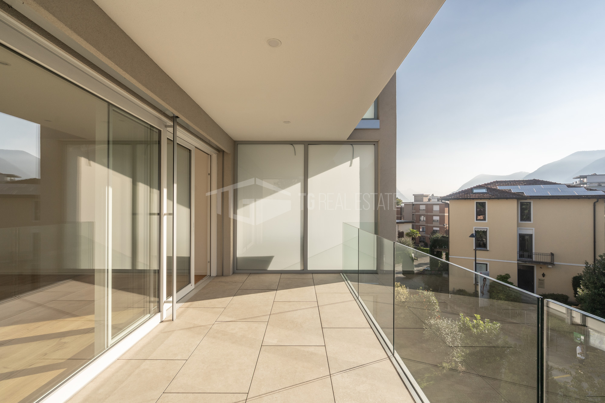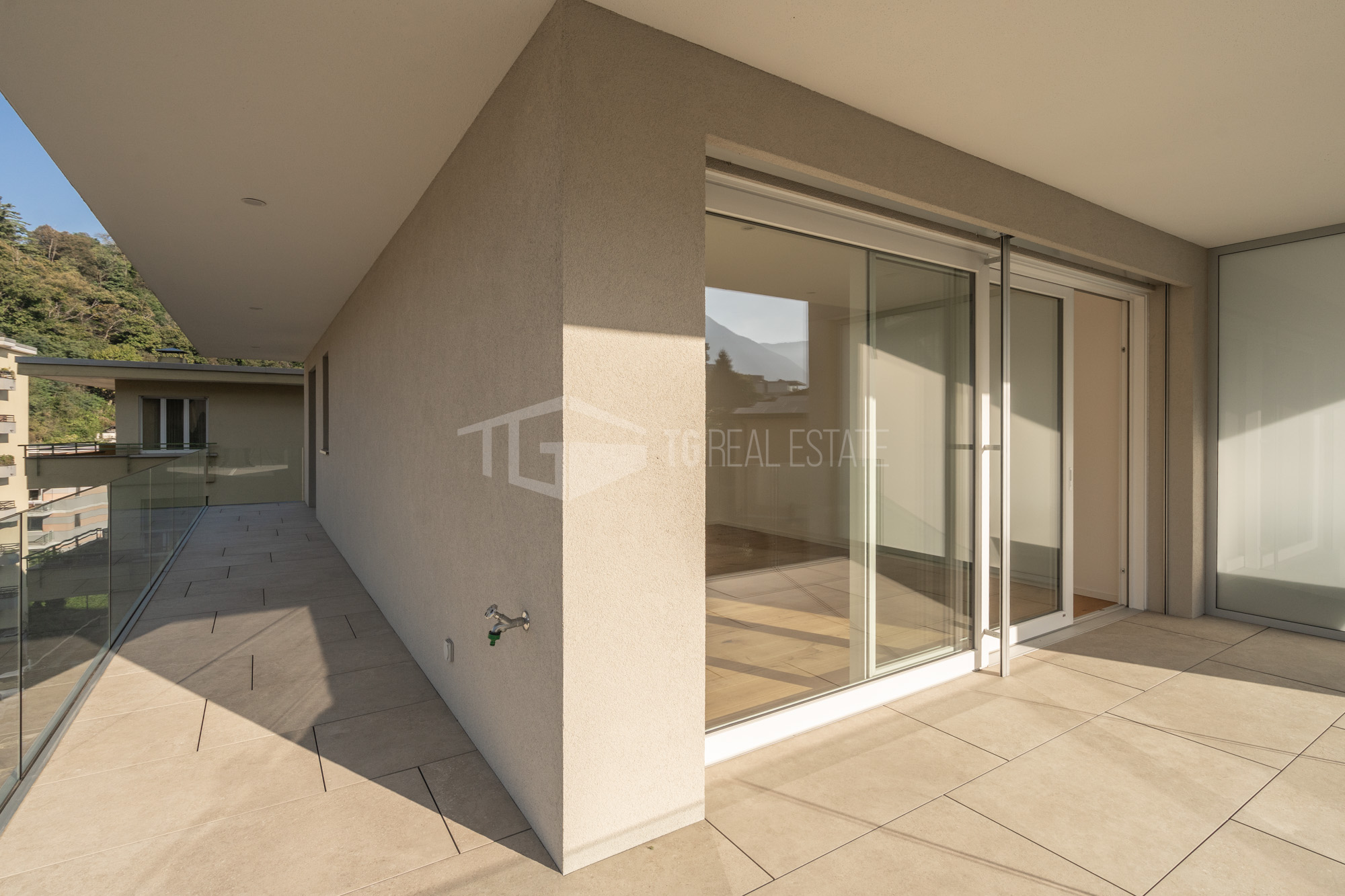 - Una zona living aperta, completamente illuminata dalla luce naturale che penetra dalle ampie vetrate. Da qui si accede a un terrazzo coperto a L.